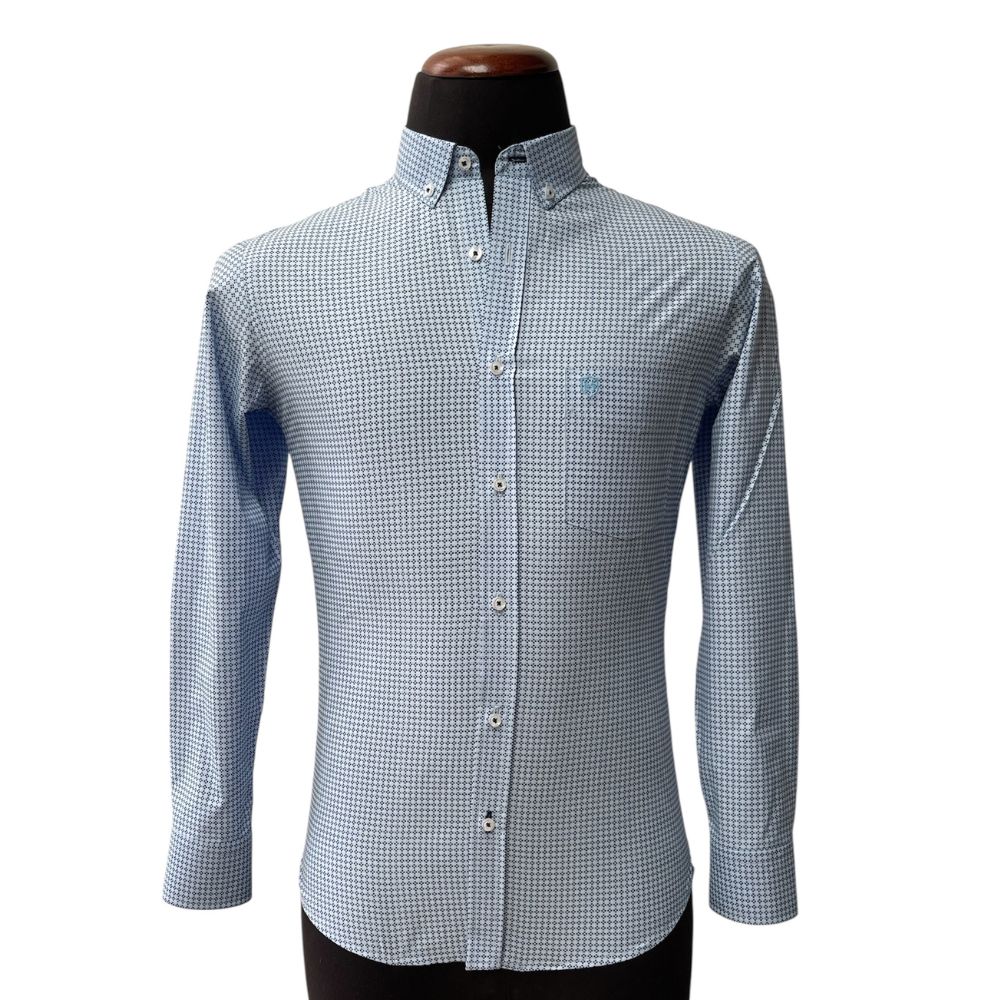 Camisa de hombre premium MONARD Sartorial azul con patrón de print. Elegancia atemporal y comodidad en manga larga.