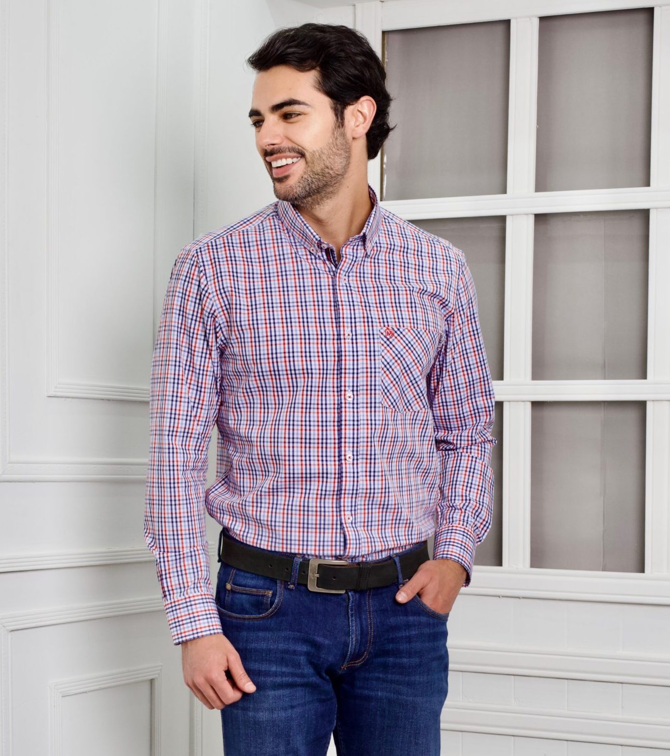 Camisa de cuadros en tonos rojo, azul y blanco. Línea premium MONARD Sartorial, combina resistencia, comodidad y un estilo elegante.